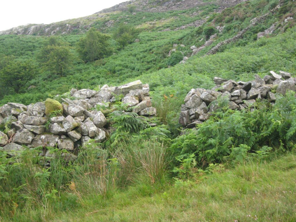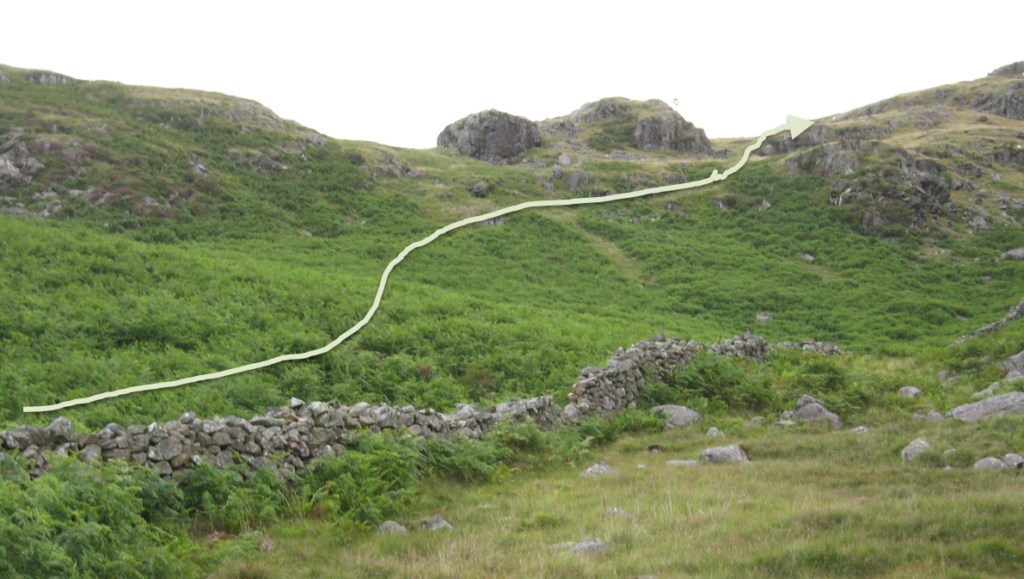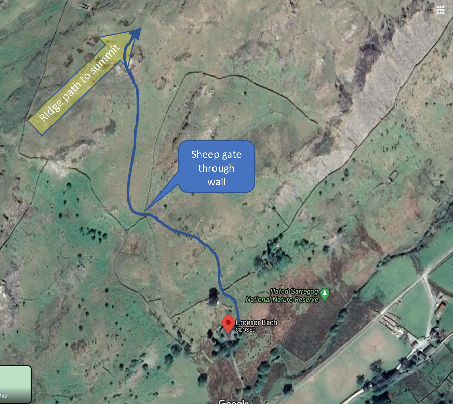 Instead head up past the stable (under the big pine tree), up a little bluff, then head left-ish until you hit the stone wall beside a boggy spring area. Please do not try to climb the wall – stone walling experts charge hundreds of pounds per yard for rebuilding damaged walls. Instead, go through the sheep gate where the walls meet [near the spring, a narrow gap about 18″ wide, for sheep to walk through, see imagery from Google Maps below]. There’s a wide plateau which you can’t see from the house – the track snakes north-west across it and up onto the ridge.